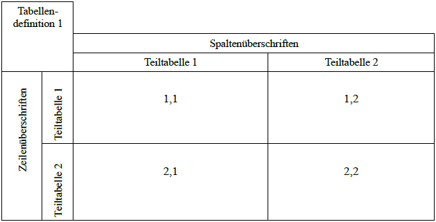 Die Gesamttabelle setzt sich im gezeigten Beispiel aus vier Teiltabellen mit jeweils gleichen Zeilen- und Spaltenbeschriftungen zusammen. Die Zeilenbeschriftung 1 erstreckt sich auf die Teiltabellen 1,1 bis 1,2, die Spaltenbeschriftung 1 auf die Teiltabellen 1,1 und 2,1 usw. Die Beschriftungen der jeweiligen Teiltabellen entsprechen den jeweils ausgewählten Merkmalen und Ausprägungen und können daher durchaus komplex sein.