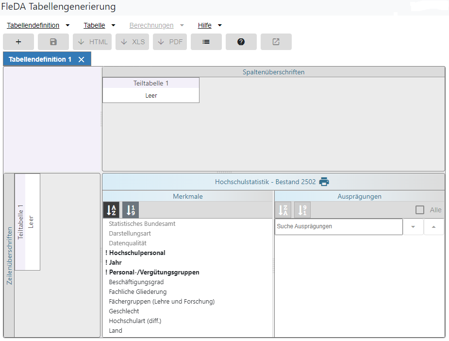 Sie können nun wahlweise mit der linken Maustaste Merkmale oder Ausprägungen auf das Feld Teiltabelle