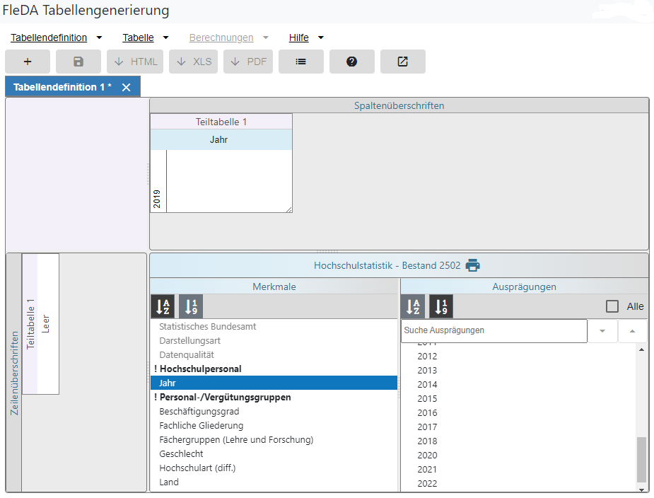 Für unser Beispiel: Für die erste Teiltabelle haben Sie bereits, wie weiter oben beschrieben, einen Datenbestand herausgesucht, der die Merkmale Vergütungsgruppe und Geschlecht mit den Ausprägungen Wissenschaftliches und künstlerisches Personal insgesamt und C4-Professorinnen/Professoren, sowie männlich und weiblich enthält. Das Merkmal Jahr sollte auch vorhanden sein. Markieren Sie jetzt das Merkmal Jahr im linken Feld, damit im rechten Feld die Ausprägungen für dieses Merkmal angezeigt werden. Ziehen Sie nun die Ausprägung 2019 auf das Feld Teiltabelle 1 unter Spaltenüberschriften und wie Sie sehen, nimmt die Tabelle erste Formen an. Als nächstes wählen Sie das Merkmal Hochschulpersonal und ziehen Sie dessen Ausprägung Personal an Hochschulen in die Tabelle unter das Merkmal Jahr. Darunter legen Sie nun aus dem Merkmal Personal-/Vergütungsgruppen die Ausprägungen Wissenschaftliches und künstlerisches Personal insgesamt und C4-Professorinnen/Professoren an. Ziehen Sie die Ausprägungen männlich und weiblich des Merkmals Geschlecht in die Zeilen.