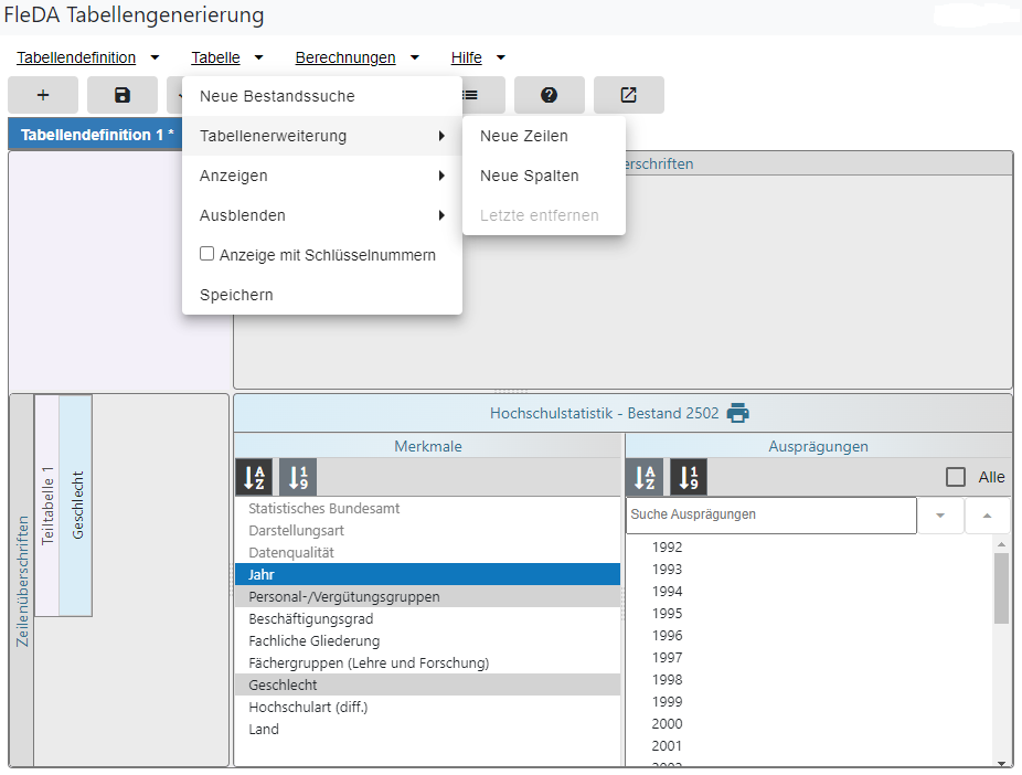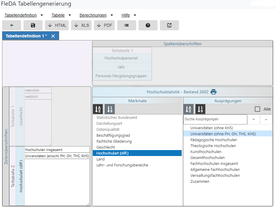 In unserem Beispiel wollen wir die Tabelle zunächst über die Zeilen erweitern (im Menü: Tabelle > Tabellenerweiterung > Neue Zeilen). Wählen Sie bitte die Schlagworte Vergütungsgruppe und Hochschulart. Bei der anschließenden Bestandswahl müssen Sie wieder darauf achten, dass die Ausprägungen Wissenschaftliches und künstlerisches Personal insgesamt und C4-Professorinnen/Professoren des Merkmals Personal-/Vergütungsgruppe sowie die Ausprägungen Hochschulen insgesamt und Universitäten (einschl. PH, GH, THS, KHS) des Merkmals Hochschulart (diff.) enthalten sind. Ferner sollte der von Ihnen gewählte Bestand endgültige Daten als Datenqualität und als Datenquelle das Statistische Bundesamt besitzen. Daneben sollte das Merkmal Jahr mindestens die Ausprägung 2019 beinhalten. Wenn Sie einen passenden Bestand gewählt haben (z. B. Bestandsnummer 2602 oder 2702), klicken Sie auf Fertig. Es erscheint Ihre Ausgangs-Teiltabelle mit den gewählten Zeilen- und Spaltenüberschriften. Der Bereich Zeilenüberschriften wurde um die Teiltabelle 2 erweitert. In diese Teiltabelle 2 ziehen Sie bitte die Ausprägungen Hochschulen insgesamt und Universitäten (einschl. PH, GH, THS, KHS).