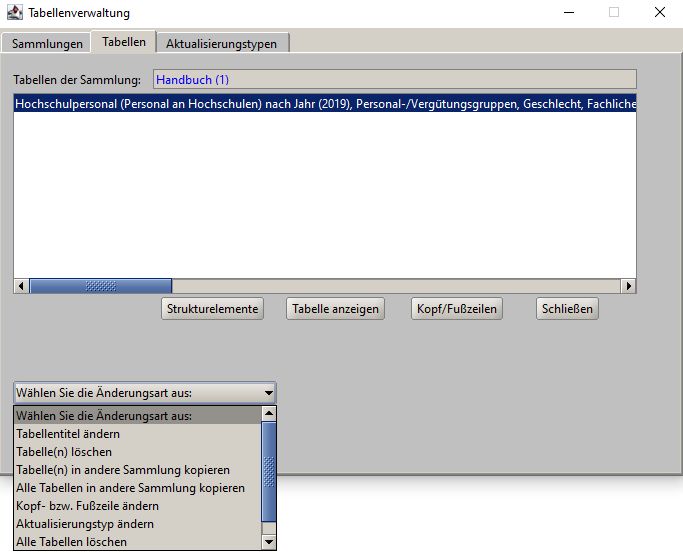 Haben Sie unter dem Menüpunkt Sammlungen (Kapitel 2.3.1) eine Sammlung im Listenfeld markiert und die Schaltfäche Tabellen anzeigen betätigt, wird Ihnen unter dem Menüpunkt Tabellen die Liste der Tabellen der gerade markierten Sammlung angezeigt (Abb. 2.8). Im Listenfeld Wählen Sie die Änderungsart aus können Sie