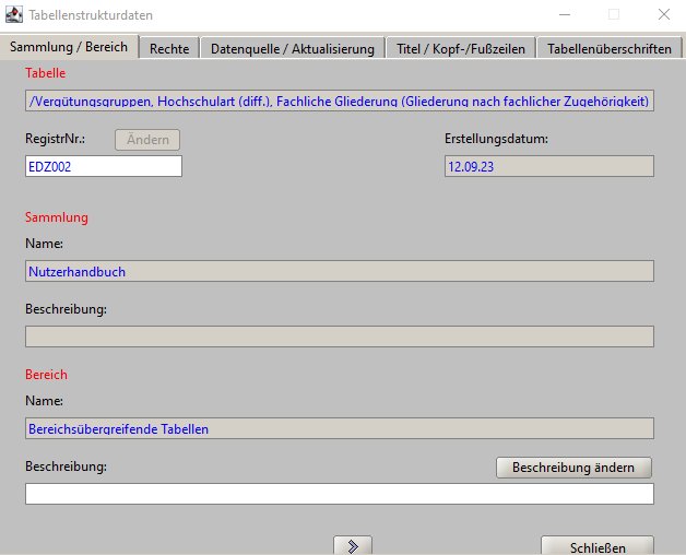 - Bearbeitung der Tabellenstrukturdaten (Bereichszuordnung, Rechtevergabe, etc.)