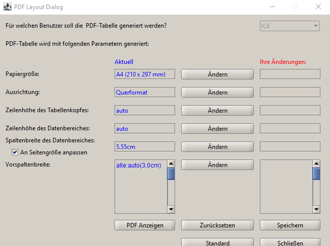Danach berechnet das Programm automatisch die passenden PDF-Einstellungen für die ausgewählte Tabelle und den Benutzer. Sie werden in der Spalte Aktuell in blau angezeigt (Abb. 2.10).