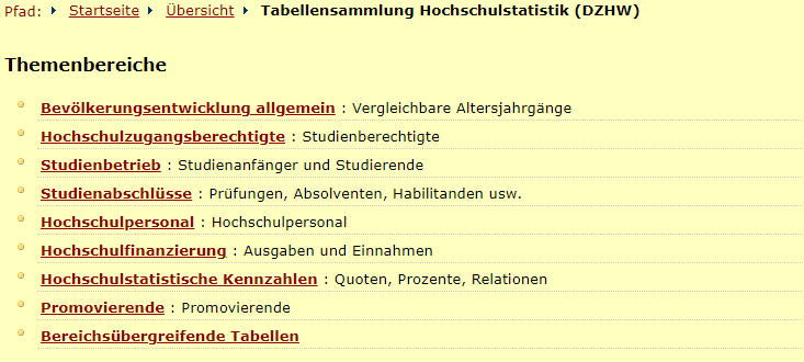 Abb. 2.12: Verzeichnis der Themenbereiche innerhalb der Sammlung „Hochschulstatistik (DZHW)“