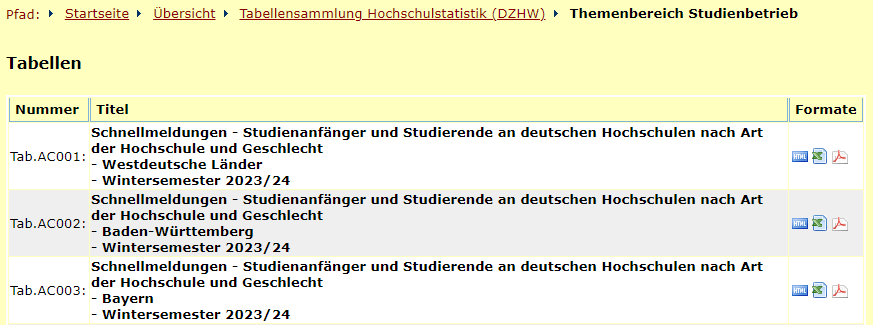 Abb. 2.13: Verzeichnis der Tabellen in der Sammlung „Hochschulstatistik (DZHW)“ zum