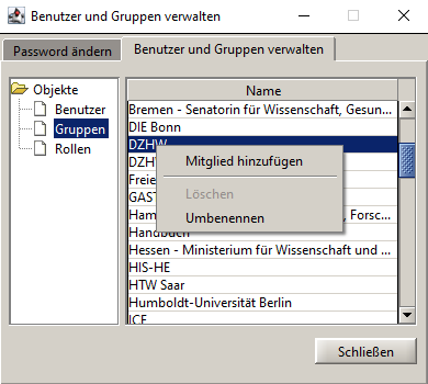 Benutzen Sie die linke Maustaste zum Anklicken der Baumknoten, erscheinen im Feld rechts jeweils zugehörige Listen der angemeldeten Benutzer*innen, eingerichteten Gruppen bzw. angelegten Rollen. Wird in der Liste ein Name mit der rechten Maustaste angeklickt, öffnet sich wiederum ein Popup-Menü, das zu weiteren Dialogfeldern führt (Abb. 2.24).