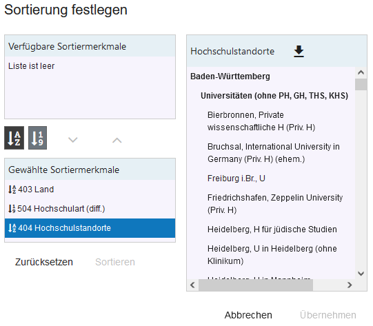 - Konnten Ausprägungen keinem übergeordneten Merkmal zugeordnet werden, dann folgen diese ohne Einrückung auf die Liste der sortierten Ausprägungen.