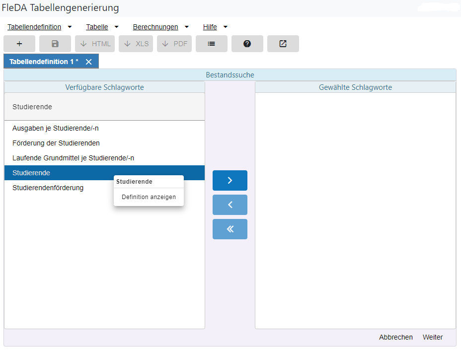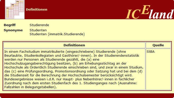 Markieren Sie zunächst aus der Schlagwortliste (oder der Merkmals- bzw. Ausprägungsliste im Menüpunkt ICE-Schlüssel) einen Begriff und klicken Sie mit der rechten Maustaste darauf. Es erscheint ein graues Feld mit dem Eintrag Definitionen anzeigen. Oben im Feld wird der markierte Begriff gezeigt, wie hier am Beispiel Studierende.