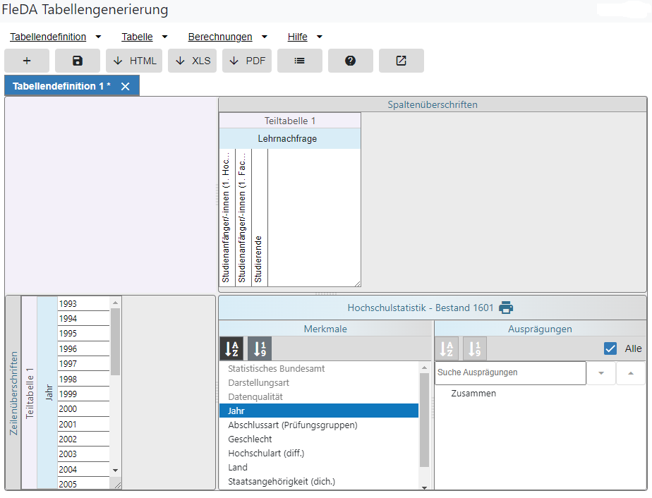 - Bei den Ausprägungen zum Merkmal Jahr handelt es sich um Zeilenausprägungen. Dementsprechend wird die Berechnungsart festgelegt: über Zeilen.