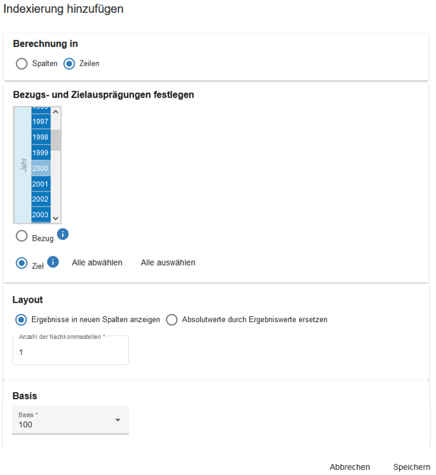 - Die Voreinstellung für die Basis ist „1“. Wählen Sie hier stattdessen „100“ (Jahr 2000 = 100%).