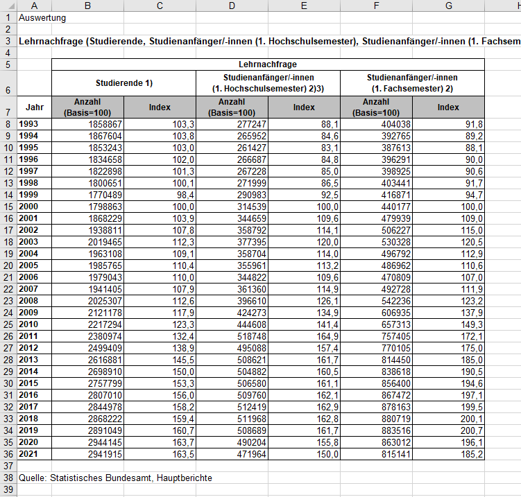 Nach der Generierung einer Tabelle mit den Zahlen zu den Studienanfänger/-innen und Studierenden (Abb. 4.7) soll die Trendentwicklung im Zeitverlauf mit dem Studienjahr 2000 als Bezugsjahr (Basis „100“) berechnet werden. Die passende Berechnungsfunktion ist die Indexierung.